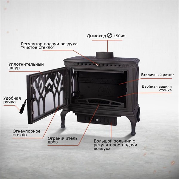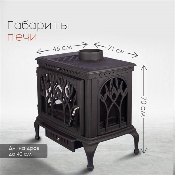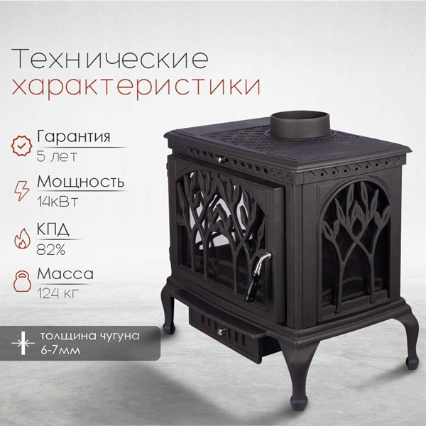 Представляем чугунную печь-камин «LOKI Forest Black» — идеальное решение для обогрева просторных помещений объемом до 380 кубических метров! Благодаря мощности в 14 кВт ваш дом всегда будет теплым и уютным. Панорамное стекло из трех стекол обеспечивает великолепный вид на пламя, создавая атмосферу настоящего уюта и комфорта. Чугунный корпус толщиной 8 мм гарантирует надежность и долговечность изделия при минимальном весе всего в 124 кг. Установка печи проста благодаря пристенному типу монтажа и удобному выходу дымохода сверху либо сзади устройства. Роскошный черный цвет подчеркивает стиль интерьера любого дома. Сделайте выбор в пользу тепла и надежности – выберите «LOKI Forest Black».