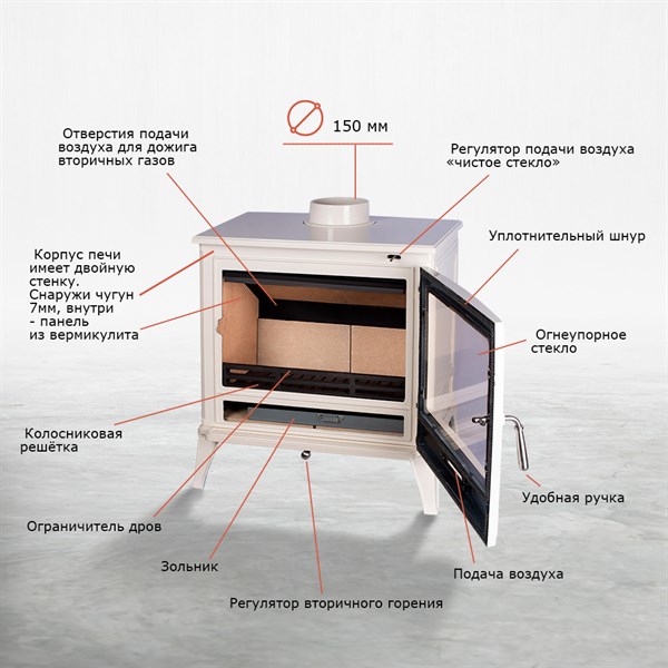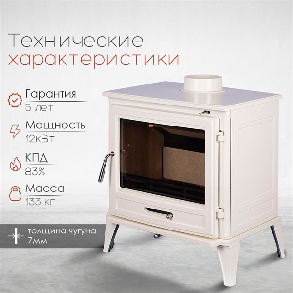 Откройте для себя уют и тепло чугунной печи-камина «Loki Norway White»! Идеальный выбор для просторных помещений (до 380м³), она быстро обогреет пространство, обеспечивая равномерное распределение тепла. Благодаря панорамному стеклу наслаждайтесь видом живого огня, добавляя уюта вашему дому. Изготовленная из прочного чугуна толщиной 8мм., эта модель сочетает надежность российского производства и стильный белый дизайн — гармонично впишется в любой интерьер! Теплотворная мощность 12кВт согревает эффективно и экономно.