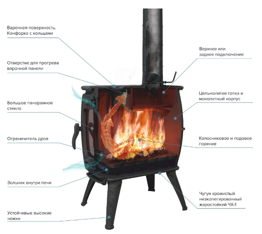 Чугунная интерьерная печь-камину "Бахта II" от Prometall обеспечит ваш дом теплом (мощностью до 12 кВт) и уютом. Удобство использования обеспечивает варочная плита и дверца со стеклом, позволяющая наслаждаться видом огня. При компактных размерах (ширина – 401 мм, высота – 810 мм), печь подходит даже для небольших помещений объемом до 180 кубических метров. Простота монтажа благодаря возможности вывода дымохода сверху или сзади. Идеальный выбор для дома, дачи или кафе!
