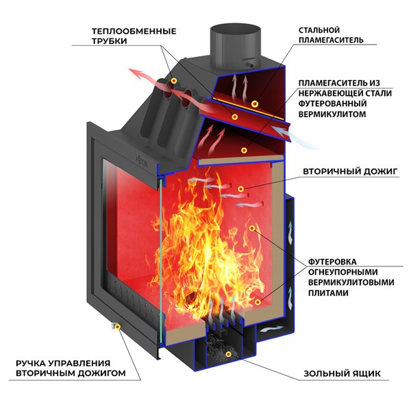 Камин ASTON Aston 800 Vyborg Амфиболит– тепло и уют вашего дома! Вместительная стальная конструкция из амфиболита эффективно обогревает помещение объёмом до 330 кубометров. Яркая панорамная дверца позволит наслаждаться живым огнём, а футеровка топки вермикулит обеспечит долговечность использования. Идеальное решение для загородного дома или дачи от российского производителя мощностью 15 кВт.