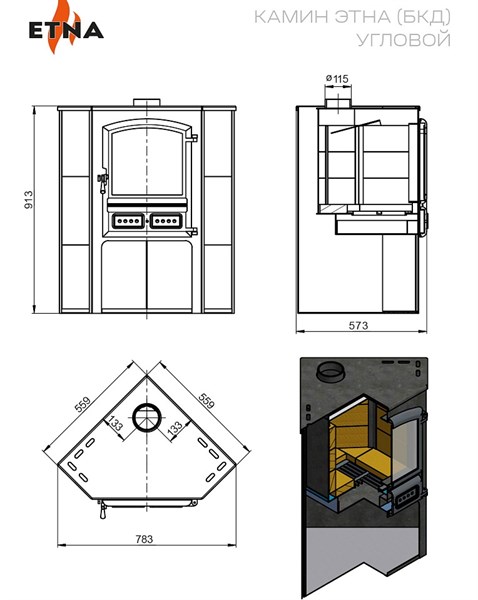 Камин ЭТНА (БКД) угловой "Талькохлорит" Ø 115мм
