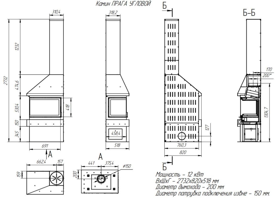 Угловой камин «Прага» от бренда Экокамин — это стильный акцент интерьера и комфорт вашего дома! Черный антрацитово-шамотный дизайн придаст помещению элегантности, а внушительная мощность в 12 кВт обогреет пространство до 240 кубометров. Двустекольная панорамная дверца позволит наслаждаться видом огня с разных ракурсов! Устанавливайте легко, используя подачу воздуха снаружи и удобный диаметр дымохода всего 200мм. Сделано качественно и надежно по всем канонам российского производства.