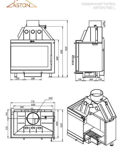 Каминная топка ASTON 700L — надёжное решение для отопления помещений объёмом до 280 куб.м., выполненное из стали с футеровкой вермикулитом для длительного сохранения тепла. Двухстекольная панорамная дверь обеспечивает приятный вид огня. Боковое открывание двери облегчает использование. Весит всего 130кг (идеально для установки в любом помещении). Производится в России компанией ASTON.