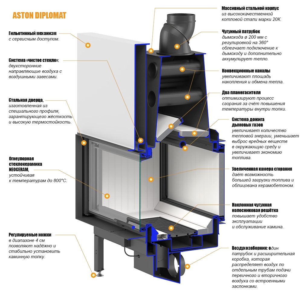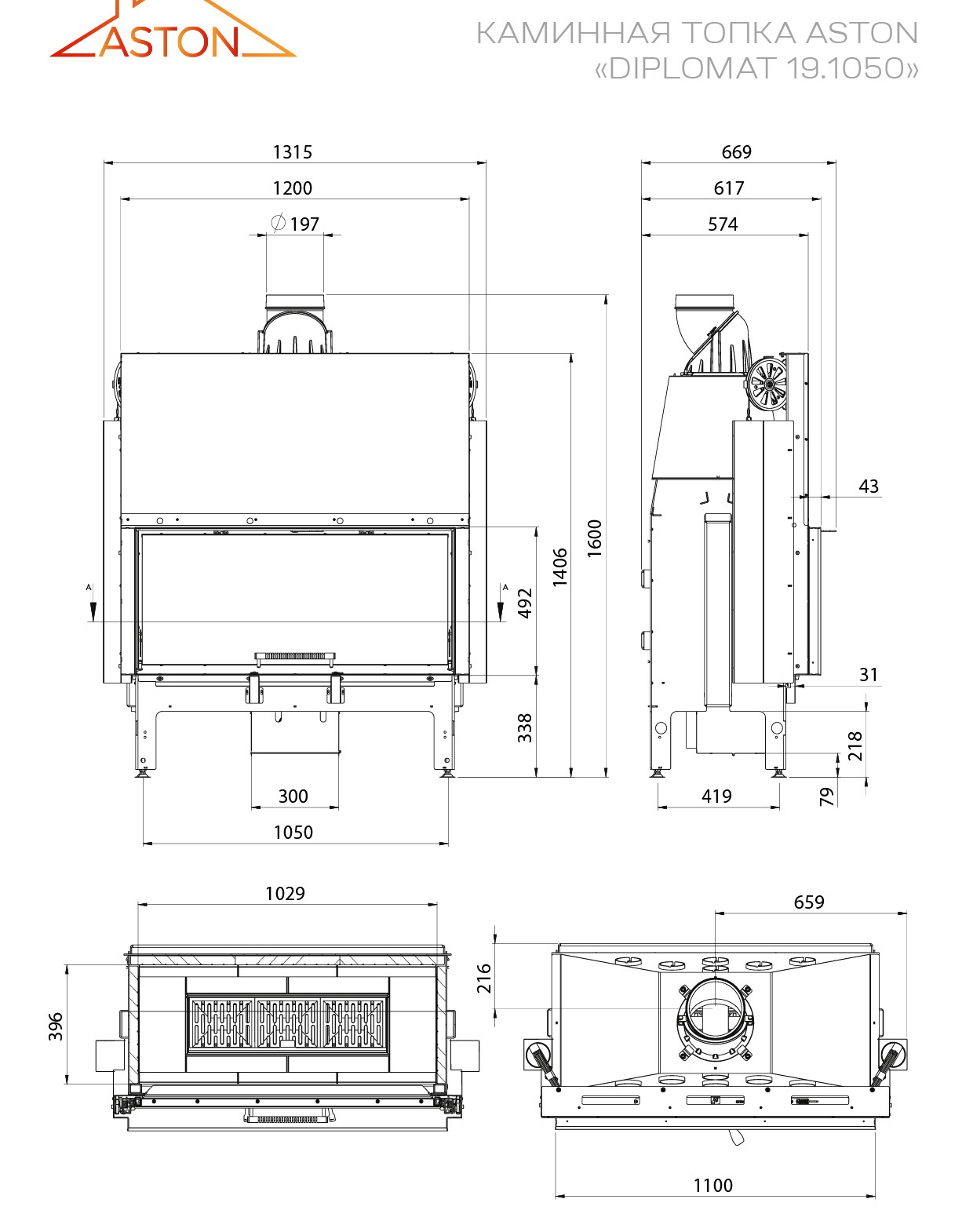Эффективное отопление дома до 380 м³ обеспечивает каминная топка Aston Diplomat 19.1050 из прочной стали и футеровкой вермикулитом. Выгодой станет подача воздуха снаружи, улучшающая эффективность сгорания древесины и экономящая тепло. Панорамное стекло антрацитового цвета добавляет интерьеру изысканности и позволяет наслаждаться видом огня. Производство — Россия. Гарантия качества и надежная работа!