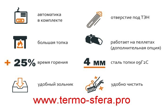 Твердотопливный котел «ТЕПЛОВЪ SMART AUTO 30» обеспечит комфортное тепло вашему дому площадью до 300 м²! Мощная стальная конструкция (толщиной 4 мм) эффективно отапливает помещения, а объем топки 93 литра позволяет долго сохранять жар. Использование дров удобно дополнено возможностью подключения ТЭН-а различной мощности (от 3 до 9 кВт). Автоматическое управление упрощает эксплуатацию благодаря вариативности режимов работы – регулятор тяги, вентилятор, пульт контроля и даже пеллетная горелка сделают процесс отопления простым и эффективным.