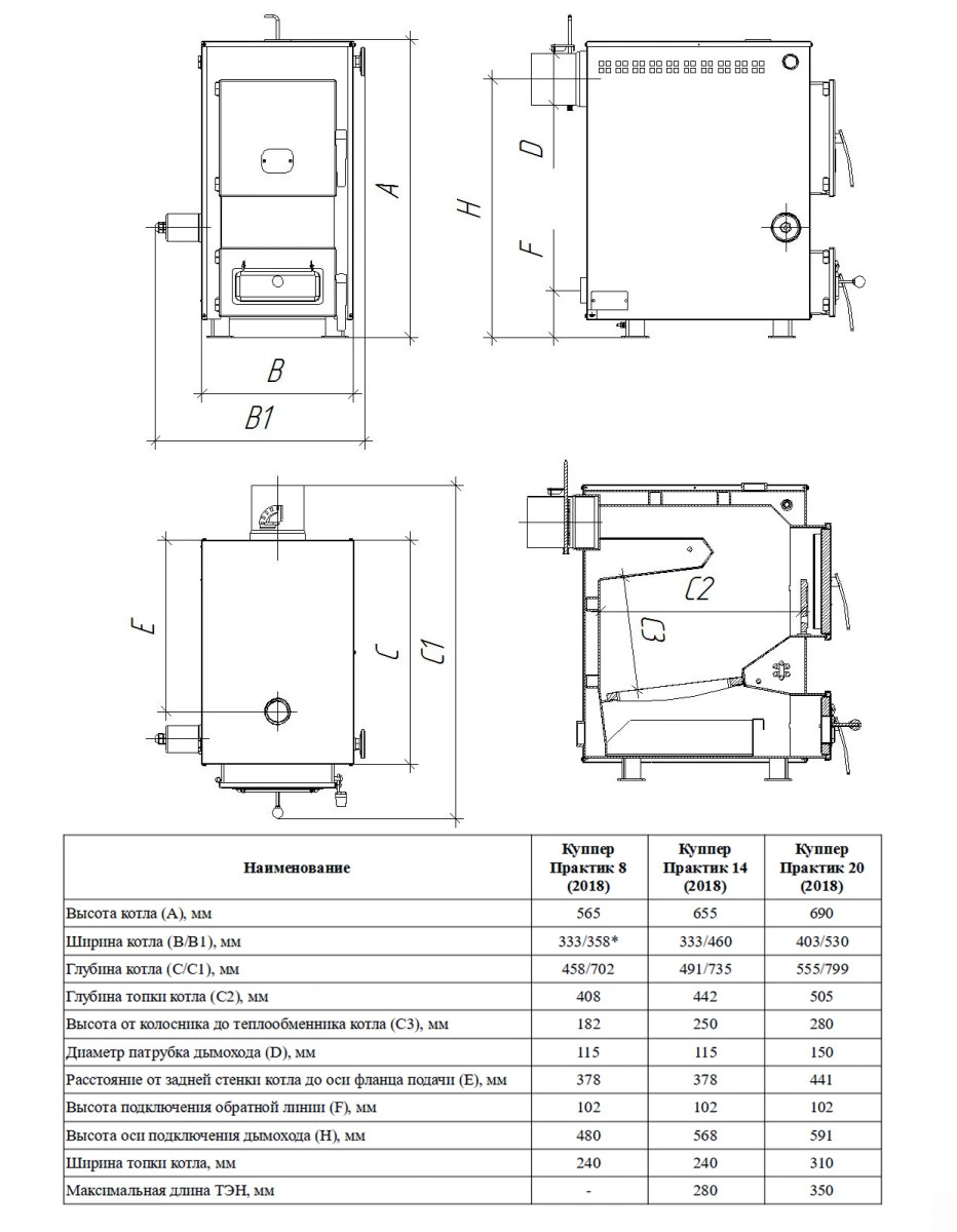 Эффективное отопление дома площадью до 140 кв.м легко обеспечивается котлом «Куппер Практик-14» от производителя «Теплодар». Удобная варочная поверхность позволяет готовить вкуснейшие блюда прямо у себя дома! Модель выполнена из прочной стали толщиной 3 мм, оснащена удобным задним выходом дымохода диаметром 115 мм. Возможна установка электрического ТЭНа мощностью 3–6 кВт и выбор удобного варианта автоматизации процесса горения — регулятор тяги либо вентилятор+пульт дистанционного управления. Удобно, практично и надежно!