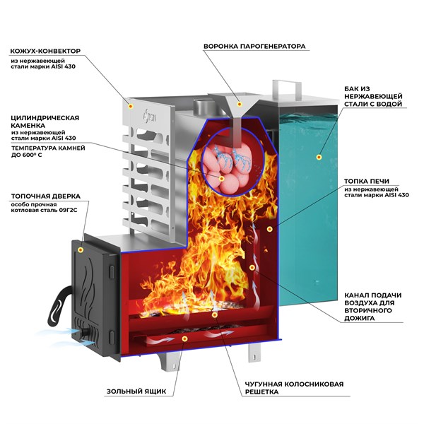 Баня — это искусство релакса! Печь Aston 12 Inox поможет вам стать мастером банного дела! Нержавейка AISI 439 гарантирует долговечность, а выносная топка добавляет комфорта. 50 л бака на трубе подарят ароматные травяные настои и возможность ополоснуться, а закрытая каменка сохранит тепло надолго. Подходит даже для больших парных объёмом до 14 кубов. Прогревайтесь правильно вместе с Aston!