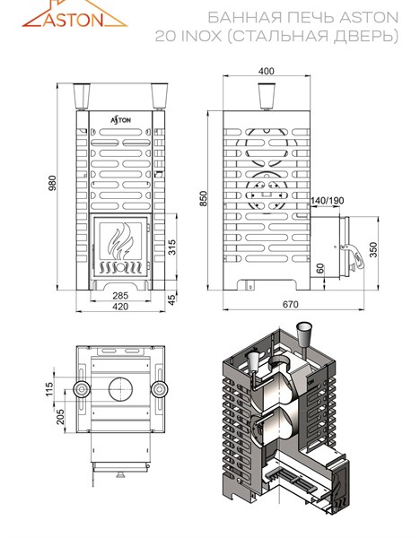 Банная печь Asthon 20 INOX — идеальный выбор для просторных парных объемом до 22 кубических метров! Надежно изготовленная из нержавеющей стали AISI 439 толщиной 3 мм, она быстро нагреет помещение и обеспечит комфортное пребывание благодаря выносной топке и удобной дверце со стеклом. Два типа каменок позволяют создать оптимальный микроклимат: закрытая каменка эффективно накапливает тепло, а дополнительный объем обеспечивает быстрый прогрев помещения. Особенностью модели является встроенный бак на трубе вместимостью 50 л., обеспечивающий наличие горячей воды без дополнительных затрат пространства. Сделано в России.