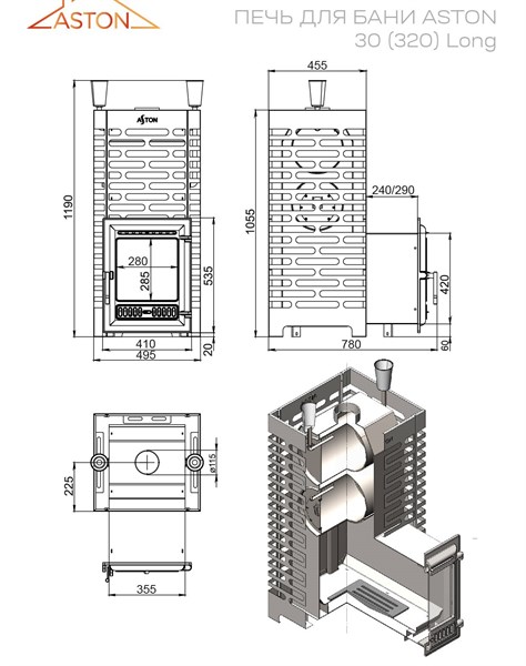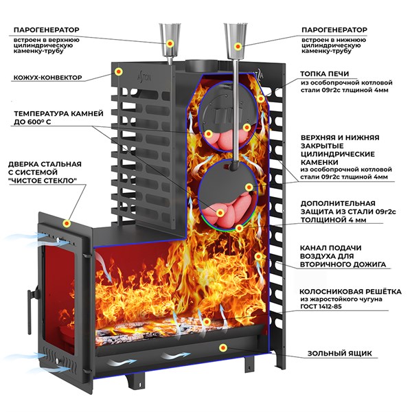 Печь для бани ASTON 30 — идеальное решение для парных объемом до 32 кубических метров. Благодаря выносной топке возможно размещение вдали от входа, обеспечивая комфортную температуру в помещении. Защита из стальной сетки толщиной 4 мм повышает безопасность эксплуатации. Сетка и загрузка дров снаружи позволяет сохранять тепло внутри помещения. Закрытая каменка вместимостью 256 кг обеспечивает мягкий прогрев и поддержание комфортной температуры российского производства!