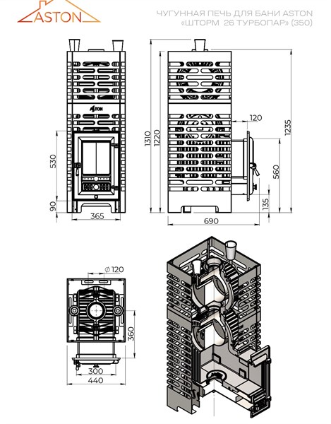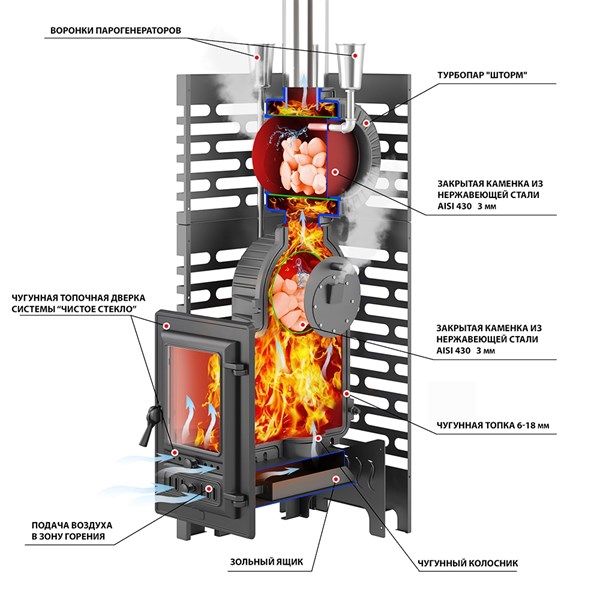 «Шторм 26 Турбопар» от бренда Aston — банная печь мечты! Для комфорта ваших посиделок объем парной составляет целых 26 кубометров! Чугунный корпус толщиной 6мм подарит надежность и долговечность, а дверца со стеклом позволит любоваться огнем и создавать романтическую атмосферу. Закрытая каменка и сетка вмещает 155кг камня, обеспечивая идеальный пар благодаря особой конструкции "Турбопара". Выносная топка позволяет размещать дрова снаружи парилки – чистый уют и порядок по вашей просьбе! изготовлено в России.