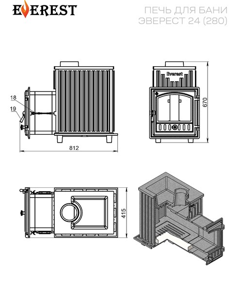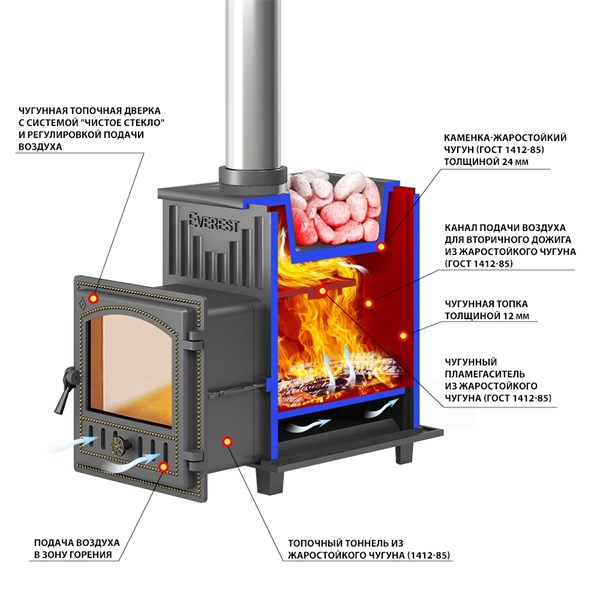 Чугунная печь «Эверест 24» идеально подойдет для вашей бани! Объем парной до 24 м³ быстро прогревается благодаря выносной топке и качественной стали толщиной 10 мм. Закажите сейчас и получите надежный источник тепла с удобным обслуживанием: дверца со стеклом позволит наслаждаться огнем и контролировать процесс горения без открытия двери. Компактные размеры (Ш×Г×В: 415×812×670 мм), вес всего 205 кг обеспечат простоту установки и экономию пространства. В комплекте только топочный агрегат для индивидуальной отделки камнем или плиткой.