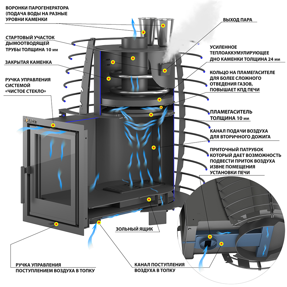 Баня – это отдых души и тела! Печь «Эверест Steam Heat» объёмом на 24 м³ быстро нагреет помещение, обеспечив идеальный микроклимат благодаря закрытой каменке (масса камня — 220 кг). Стальная конструкция толщиной 4 мм и вес 120 кг гарантируют долговечность. Изящная дверца со стеклом добавит интерьеру баньки особого шарма. Удобно и просто растапливается дровами. Красота России начинается у вас дома!
