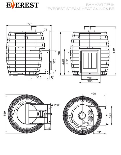 Баня – это отдых души и тела! Подарите себе удовольствие истинного комфорта с дровяной печью «Эверест Steam Heat» 24 INOX из высококачественной нержавеющей стали (толщиной 4мм) объемом до 24м³. Благодаря закрытой каменке и дверце со стеклянным окошком ваша банька наполнится приятным теплом и уютом всего за несколько минут! Закажите прямо сейчас русскую печь от российского производителя по выгодной цене!