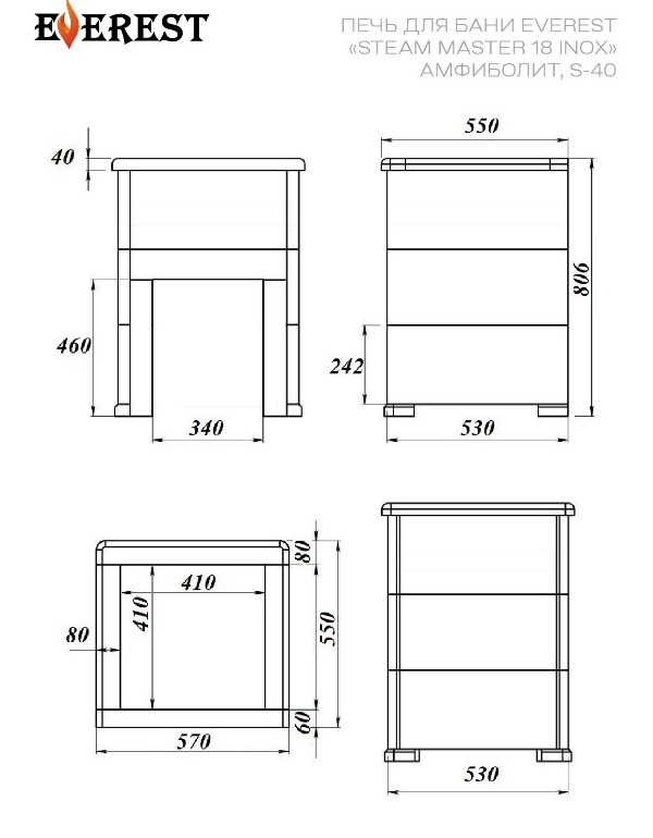 Баня – это отдых души и тела! Печь «Эверест Steam Master 18 INOX» обеспечит вам идеальный банный ритуал: — Парная объёмом до 18м³ — тепло для всей компании! — Корпус из нержавеющей стали прослужит долго даже при интенсивных банных сессиях; — Каменка на 15кг создаёт лёгкий целебный пар благодаря амфиболиту; — Удобство использования обеспечивает дверца со стеклом и выносная топка. Создайте уютную атмосферу своими руками вместе с российской печью Everest!
