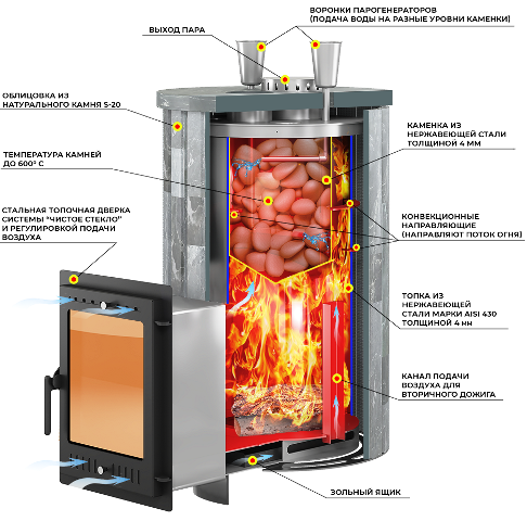 Баня – это здоровье! Приобретите печь «Эверест Steam Master 30 INOX» и наслаждайтесь паром высшего качества! Нагревает помещение объемом до 30 м³ всего за несколько минут. Массы камней в 45 кг достаточно для долгого сохранения тепла и ароматного пара. Надежность конструкции обеспечивает кожух из натурального талькохлорида и нержавеющая сталь выносная топка облегчает процесс закладки дров. Удобство использования обеспечит дверца со стеклом. Наслаждайтесь банными процедурами уже сегодня!
