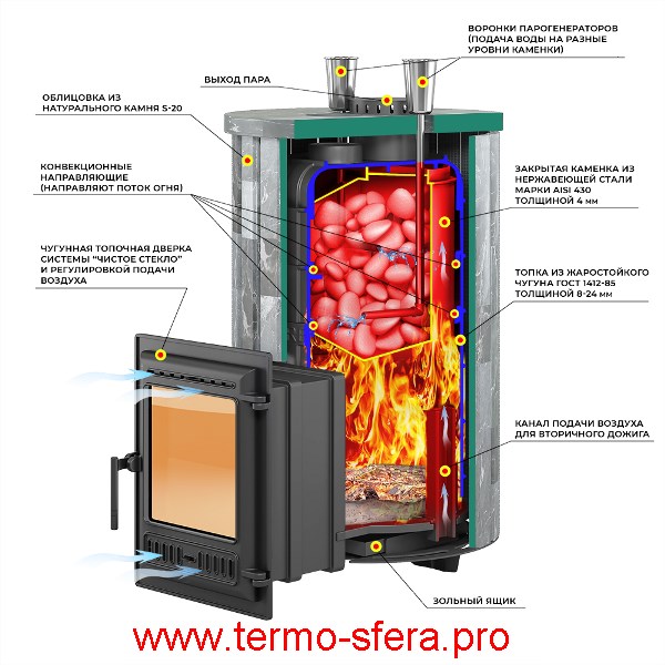 Коммерческая банная печь «Эверест Steam Master 44» – это сочетание комфорта, эстетики и долговечности! Идеальна для парных объемом до 44 куб.м., выполнена из надежного чугуна толщиной 8мм, имеет выносную топку и закрытую каменку массой 65кг, обеспечивая равномерное распределение тепла. Кожа талькохлорита дарит приятный визуальный эффект и сохраняет тепло долго. Серые оттенки дизайна идеально дополнят интерьер вашей сауны. Производится в России компанией Everest.