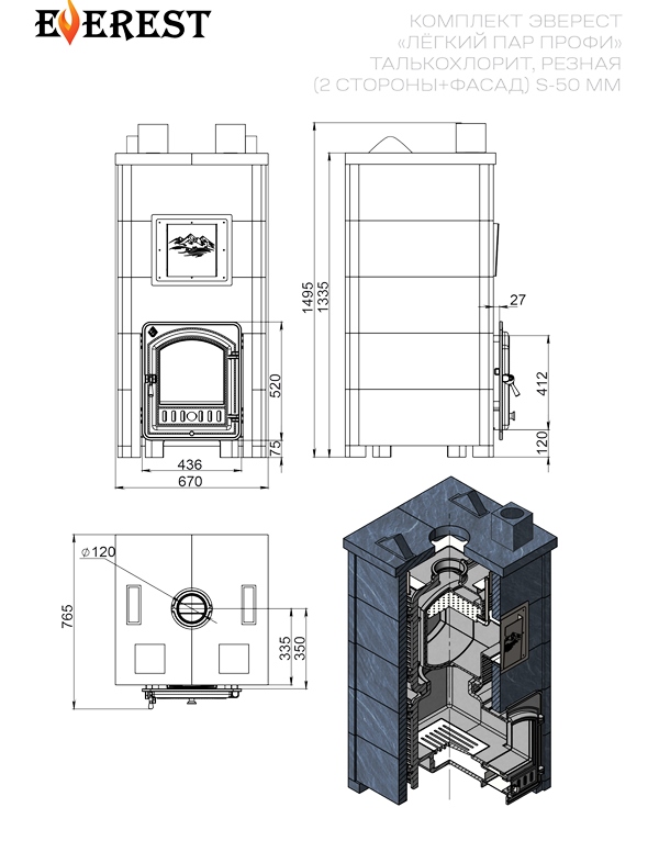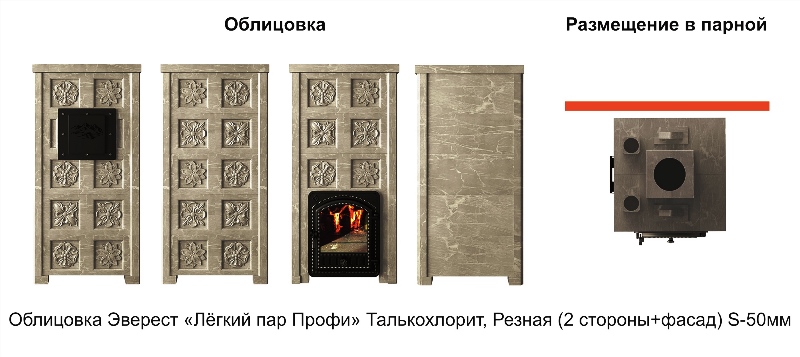 Эту печь-профессионала по имени "Эверест Легкий Пар Профи" просто обязан позвать к себе каждый ценитель настоящего пара по-серому! Она легко поместится даже в небольшой парной объёмом от 44 кубов, а её талькохлоритовое облачко тепла подарит мягкое и полезное тепло. В наборе – чугунная каменка для камней на 60 кг, дверца-стекло и рассчитана на топку из парной. А ещё она умеет удивлять своей изящной резьбой сразу с двух сторон и фасада!