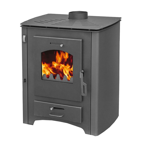 Стальная топка внутри полностью усилена шамотом, что позволяет защитить металлические части камина от перегрева. Регулировка горения осуществляется при помощи заслонки, расположенной на зольном ящике, а также в дверце.