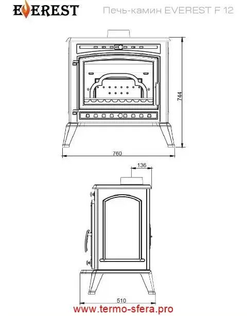 Чугунная печь-камин Everest F12 – идеальное решение для отопления помещений объемом до 320 куб.м., обеспечивающее тепло и уют вашего дома. Благодаря панорамному стеклу вы сможете наслаждаться видом горящего огня. Преимуществом модели является мощность 12 кВт при компактных размерах (глубина всего 510 мм), вес печи составляет лишь 126 кг. Установка проста благодаря пристенному типу монтажа и верхнему выходу дымохода диаметром 150 мм. Сделано в России из чугуна толщиной 8 мм.
