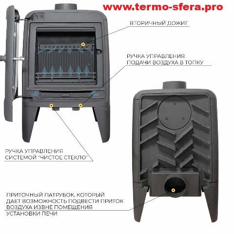 Печь оснащена системой подачи воздуха извне, что обеспечивает эффективную работу и безопасность. Использование чугуна толщиной 8 мм гарантирует долговечность конструкции и равномерное распределение тепла. Простота монтажа благодаря заднему выходу дымохода и пристенному типу установки. Элегантные цвета антрацита и черного подчеркивают стиль и изысканность модели.