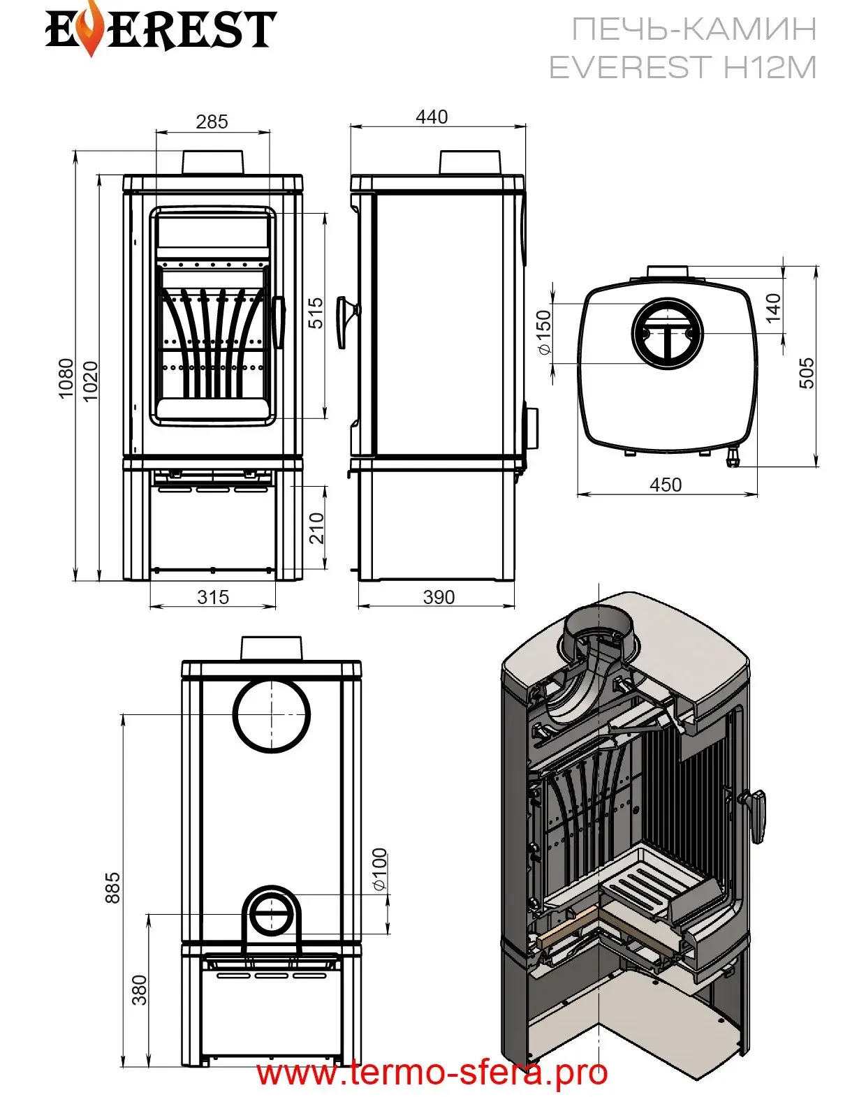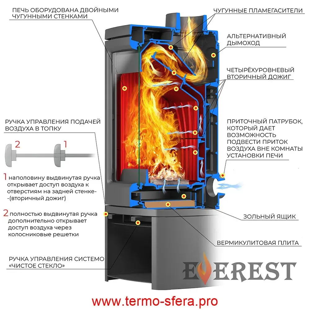 Чугунная печь-камин EVEREST Н12М – это надежное решение для отопления помещений объемом до 200 куб.м., обеспечивающее комфорт и уют панорамным обзором пламени. Благодаря притоку воздуха извне, прибор эффективно работает даже при закрытых окнах. При компактных размерах (ширина 550 мм, высота 1080 мм) он легко встраивается в интерьер, а два варианта цвета подчеркнут индивидуальность вашего дома. Производство – Россия.