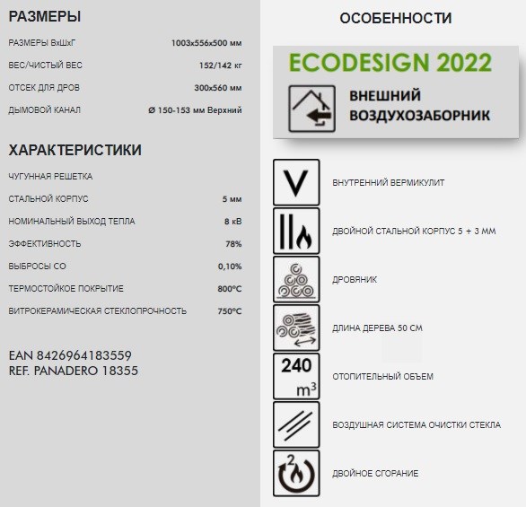 Испанский камин-печь Panadero Delta — элегантное решение для обогрева помещений объемом до 240 м³! Изящная черная сталь толщиной 5 мм., футеровка из вермикулита обеспечивает долговечность, а панорамное стекло дарит удовольствие наблюдать за пламенем. Подача воздуха снаружи ускоряет розжиг и улучшает теплоотдачу. Элегантно вписывается в любой интерьер гостиной, добавляя уюта вашему дому. Испанская качественность и стиль в каждом элементе!