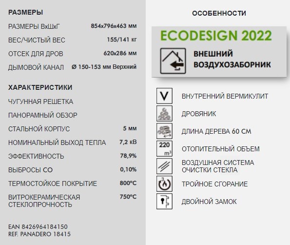 Испанский камин-печь Panadero Fenix — это гармония стиля и функциональности! Идеально подходит как для дома, так и для дачи. Эффектное черное панорамное стекло позволяет наслаждаться видом пламени, создавая уютную атмосферу. Сталь толщиной 5 мм и вермикулитовая теплоизоляция обеспечивают надежность и эффективность работы. Компактные размеры и вес позволяют легко интегрировать его в любой интерьер. Выполнит не только роль декоративного элемента, но и эффективно обогреет помещение объемом до 220 кубических метров.