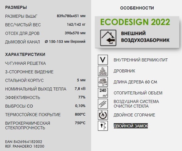 Испанский камин-печь Panadero Iris — элегантное решение для вашего дома! Мощная модель на 8 кВт эффективно обогреет помещение объёмом до 240 кубических метров. Три стеклянные панорамы двери позволяют наслаждаться живым пламенем с любого угла. При компактных размерах (высота – 839 мм, ширина – 780 мм), эта модель идеально впишется даже в небольшое пространство. Благодаря футеровке из вермикулита и подаче воздуха снаружи, обеспечивает максимальную эффективность горения.