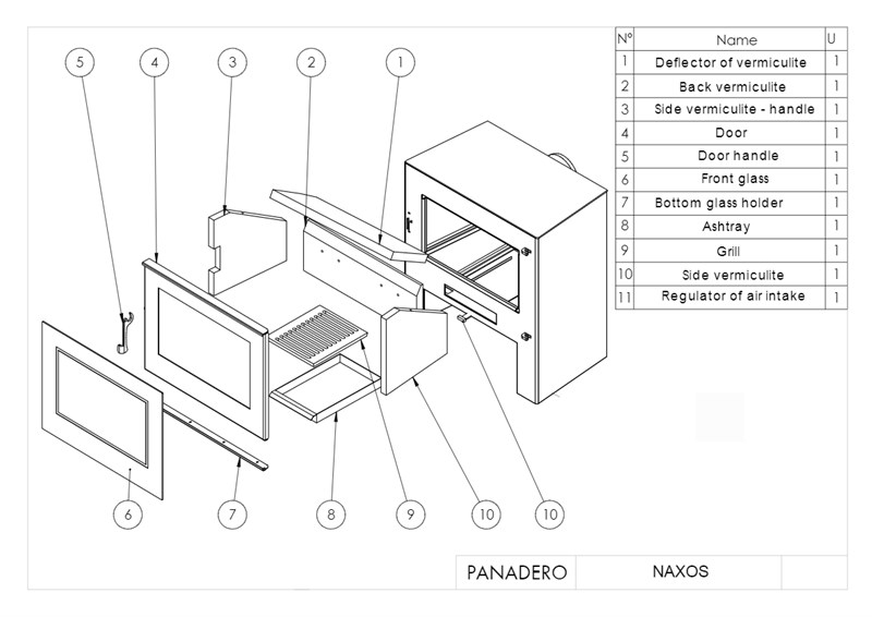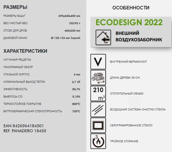 Испанский камин-печь Panadero Naxos — идеальное решение для обогрева просторных помещений! До 220 м³ тёплого воздуха всего от 7 кВт мощности. Элегантная черная сталь толщиной 4 мм., панорамное стекло двери и компактные габариты (695х640х400 мм.) гармонично впишутся в любой интерьер. Благодаря длине дров до 500 мм., подаче воздуха снаружи и заднему выходу дымохода установка становится простой и удобной. Испанские технологии качества согревают ваш дом!