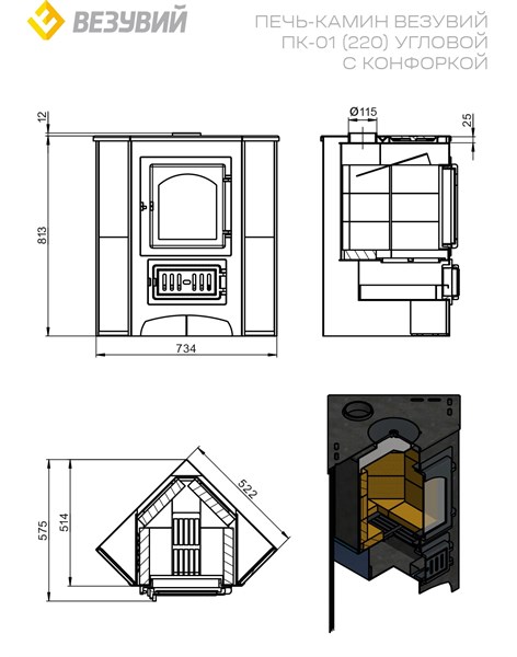 Угловая печь-камин «Везувий ПК-01» мощностью 9 кВт эффективно обогреет помещение до 150 м³! Дверца 220 и красивый красный цвет и стекло на дверце создадут уютную атмосферу. А возможность готовить пищу на встроенной конфорке — дополнительный комфорт при отсутствии электричества. Изготовлена из качественной стали толщиной 3 мм., диаметр дымохода 115 мм. Простота монтажа и доступная цена делают её идеальным выбором для дома или дачи от российского производителя.