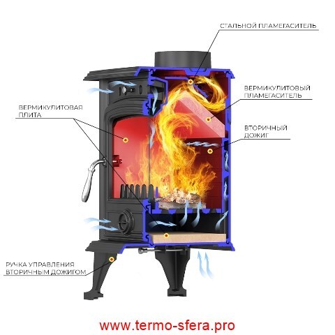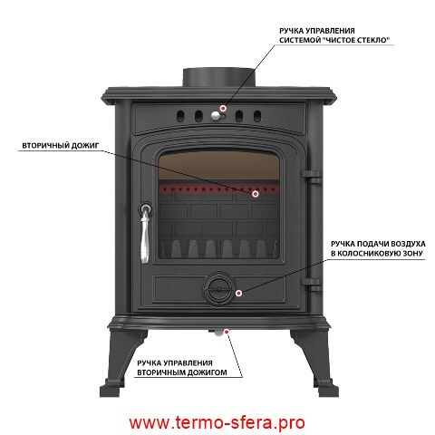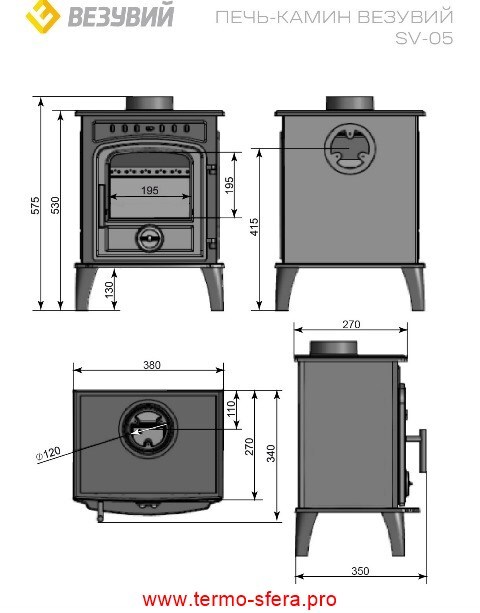 Чугунная печь-камин «Везувий SV-05 Антрацит» – оптимальное решение для отопления помещений объемом до 100 куб.м., выполненное в стильном черном цвете (антрацит). Достоинства модели: • Компактные размеры (ширина 380хглубина 340хвысота 575мм) позволяют устанавливать как пристенно, так и уголовом; • Удобство эксплуатации благодаря дверце со стеклом; • Надежность российского производителя; • Высокая мощность — 5кВт при экономичном весе всего 50кг.