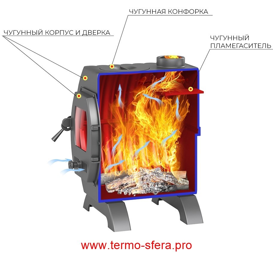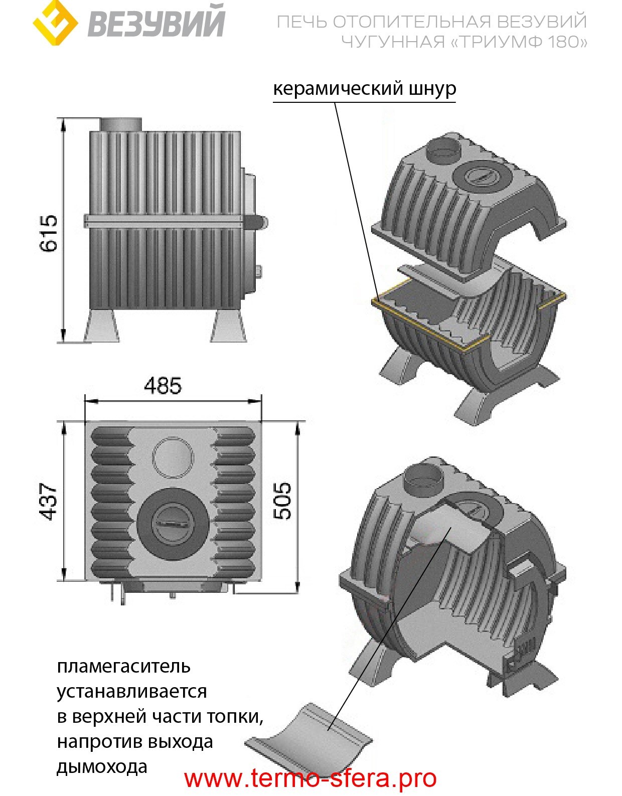 «Везувий Триумф 180» — как тепло римских терм у вас дома! Чем хорош? Эта чугунная печь-гигант обогревает помещение до 180 кубометров, выглядит солидно (антрацитово-чёрный дизайн), да ещё и обед вам приготовит благодаря варочной плите! Устанавливайте где удобно: уголком или пристенно. Габариты печи удобны даже для небольших пространств, а вес надёжности — целых 98 кг! Сделано в России, толщина чугуна – внушительные 12мм.