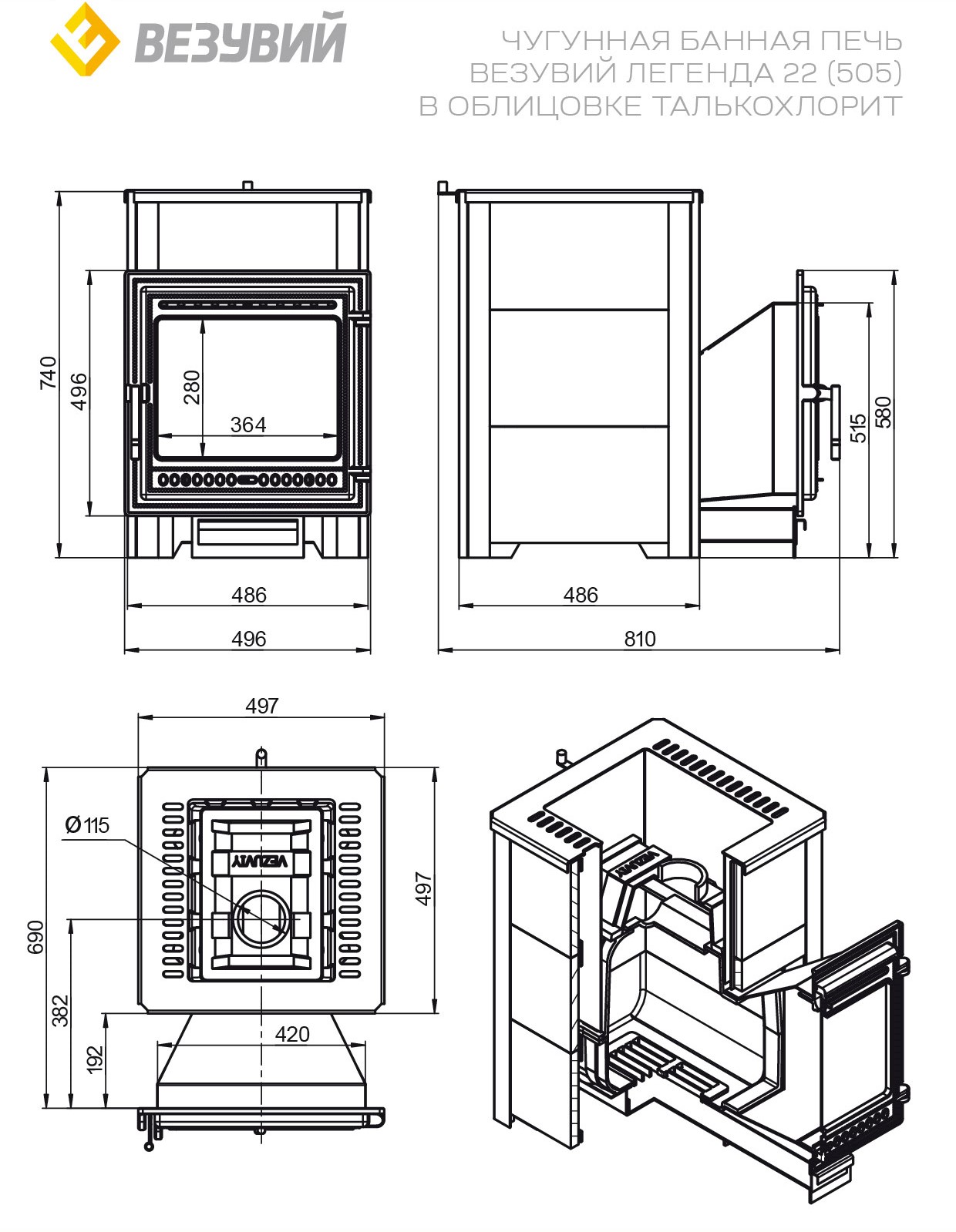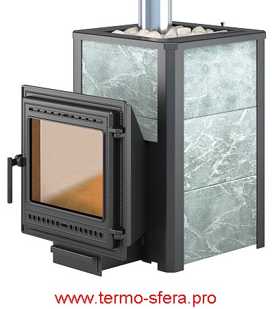 Банная печь ЛЕГЕНДА 22 (505) укомплектован чугунной каминной дверцей Везувий 505 с большим жаропрочным стеклом «SCHOTT ROBAX»