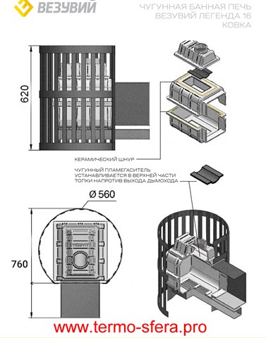 Чугунная печь «Легенда Ковка» от российского производителя «Везувий» эффективно прогревает помещение объемом до 18 кубометров, обеспечивая комфортную температуру парной всего за несколько минут благодаря выносной топке и массе загружаемых камней 120 кг. Прочный чугун толщиной 8 мм гарантирует надежность конструкции при интенсивном использовании. Емкий объем камеры сгорания позволяет экономить топливо и поддерживать тепло длительное время. Компактные размеры (ширина — 560 мм, высота – 620 мм) подходят даже для небольших помещений.