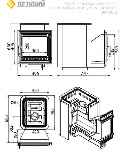 Чудо-техника от российского бренда «Везувий» — дровяная печь «Сенсация 22 Антрацит». Удобна и эффективна благодаря чугунному корпусу толщиной 8 мм и конвекционному кожуху. Компактные размеры (ширина – всего 420 мм) позволяют установить её даже в небольшой бане. Выносная топка облегчает загрузку дров, а вместимость камней в 20 кг гарантирует быстрый нагрев воздуха и сохранение тепла. Длина дымохода 115 мм обеспечивает эффективное удаление продуктов сгорания. Идеальна для парных объемом до 24 кубических метров!