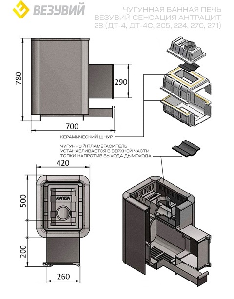 Чугунная дровяная печь «Сенсация 28» с дверцей ДТ-4 от российского производителя «Везувий», идеально подходит для саун и бань объемом до 30 куб.м., быстро прогревает помещение благодаря выносной топке и конвекционному кожуху. Преимущества: – Быстрое нагревание помещения; – Надежность чугуна толщиной 8мм; – Компактные размеры (ШхГхВ: 420x700x780мм); – Удобство эксплуатации при весе всего 100кг; – Традиционное русское качество производства России.