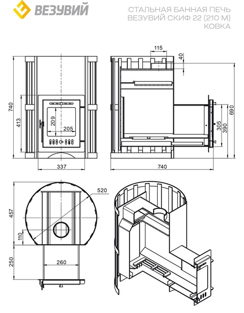 Печь дровяная "Везувий Скиф Ковка 22" — Скиф Ковка 22 (210) "М" это надежное решение для саун и бань объемом до 24 кубических метров. Особенности модели: - Металлический корпус из стали толщиной 6 мм; - Компактные размеры (ШхГхВ): 520x740x740 мм; - Емкость загрузки камней – 100 кг; - Топочное окно оборудовано жаропрочным стеклом; - Система выносной топки обеспечивает удобство использования; - Производство – Россия.