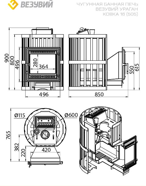 «Везуний ураган!» Печь-подарок для вашей сауны! Из чугуна толщиной 8мм — тепло долго сохраняется! Дверь-сцена «Панорама» покажет огненный спектакль, а закрытая каменка добавит аромата ваших любимых трав. Нагревает до 18м³ пространства выносной топкой — наслаждайтесь банными процедурами без беготни за дровами! Продукт российских мастеров от бренда «Везувий». Весит всего 113кг, так что справитесь даже вы с другом! Везувий каминная 505!