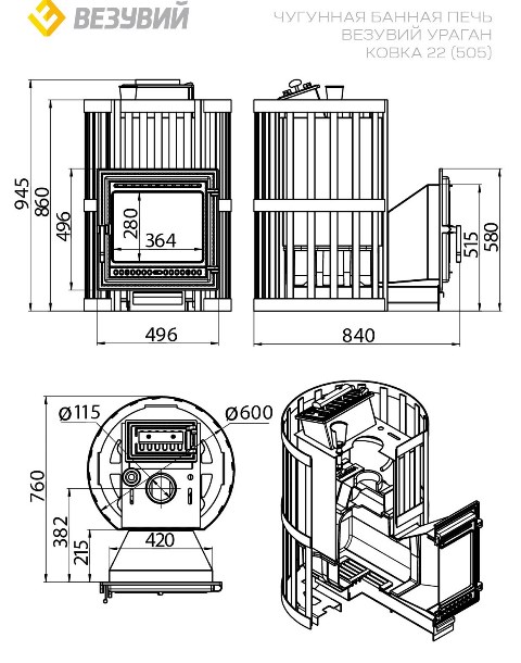 Чугунная печь «Везувий Ураган Ковка 22» — идеальное решение для просторных бань объемом до 24 кубических метров. Благодаря закрытой каменке быстро нагревает помещение и поддерживает стабильную температуру. Панорамное стекло дверцы обеспечивает визуальное удовольствие от огня; выносная топка позволяет разместить дровяную печку близко к стене. Удобна в установке благодаря компактным размерам и сетчатому кожуху российского производства. Дверца -везувий каминная 505.