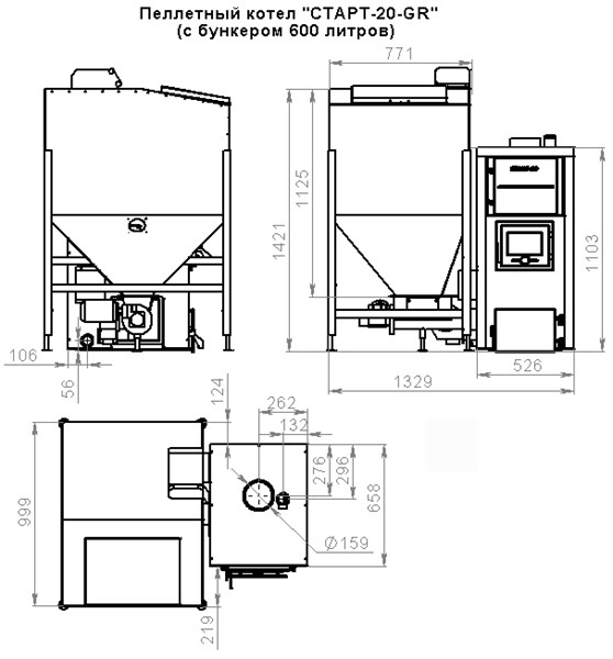 Компактные размеры (высота – 1100 мм, ширина – 1155 мм), стальной корпус толщиной 6 мм обеспечат долговечность эксплуатации при мощности 20 кВт, отапливая помещение площадью до 200 кв.м.