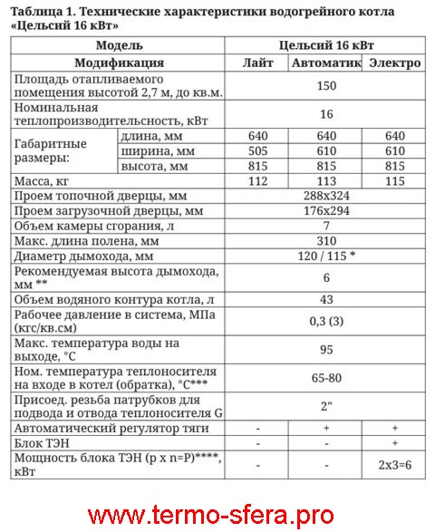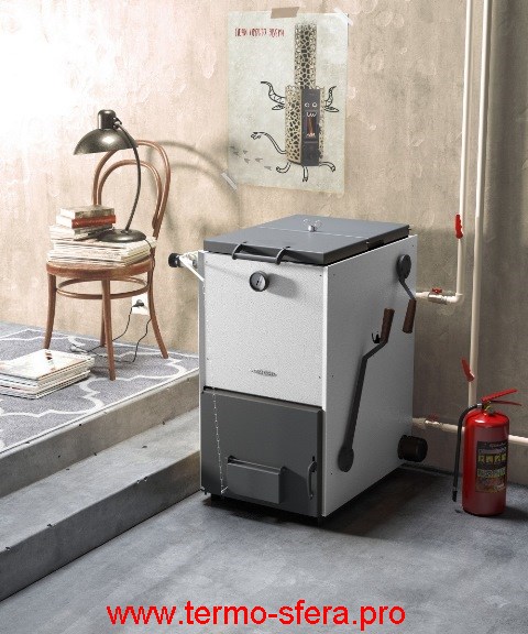 Данная модель отопительного котла отличается высокой мощностью (16 кВт) и способна эффективно обогревать помещения общей площадью до 150 кв.м. Изготовлен из стали толщиной 3 мм., что обеспечивает его надежность и долговечность. Котел может работать как на угле, так и на дровах, а также имеет возможность установки электрического ТЭНа различной мощности (от 3 до 6 кВт). Управление процессом горения осуществляется при помощи регулятора тяги, а контроль работы ТЭНов – дистанционно, посредством пульта.
